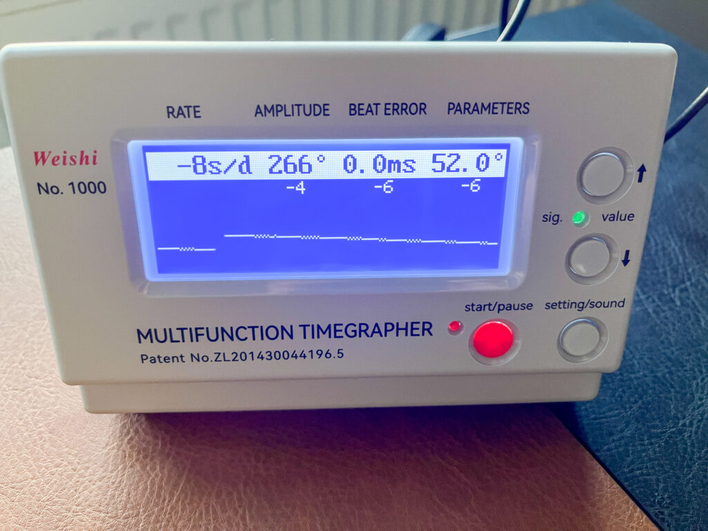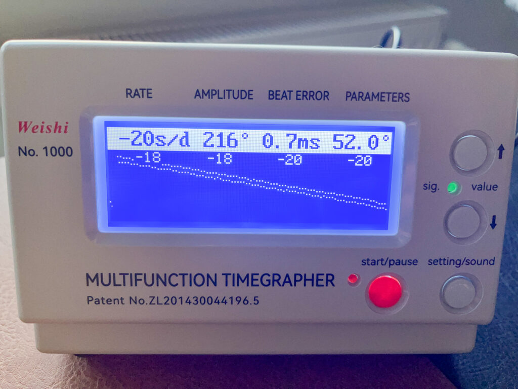 If your timegrapher consistently shows low amplitude in all positions or dramatically off readings in just one position, it’s time for a service. Also, always measure your watches when they are fully wound, as a partially wound mainspring delivers less power, leading to lower beat rates.
