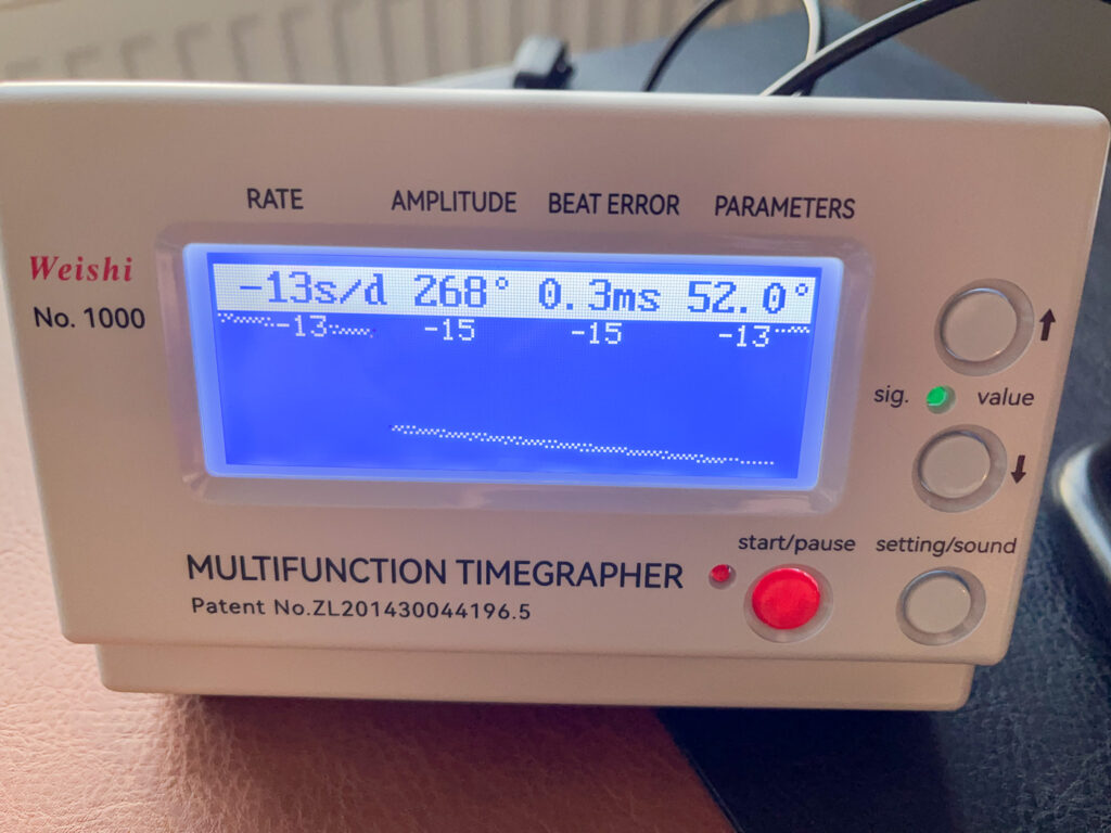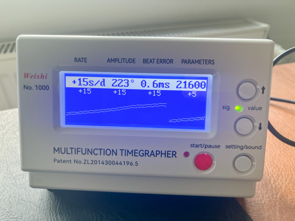 To my surprise, the amplitude was close to 300 degrees. Remember what I mentioned earlier about Tudors and Rolexes? This gave me an idea—what if I measured each of my watches daily over a week? I could take the first measurement before putting it on, after winding if necessary, and a second measurement at night before placing it back in the watchbox. It’s an intriguing experiment—I’ll have to give it some thought.