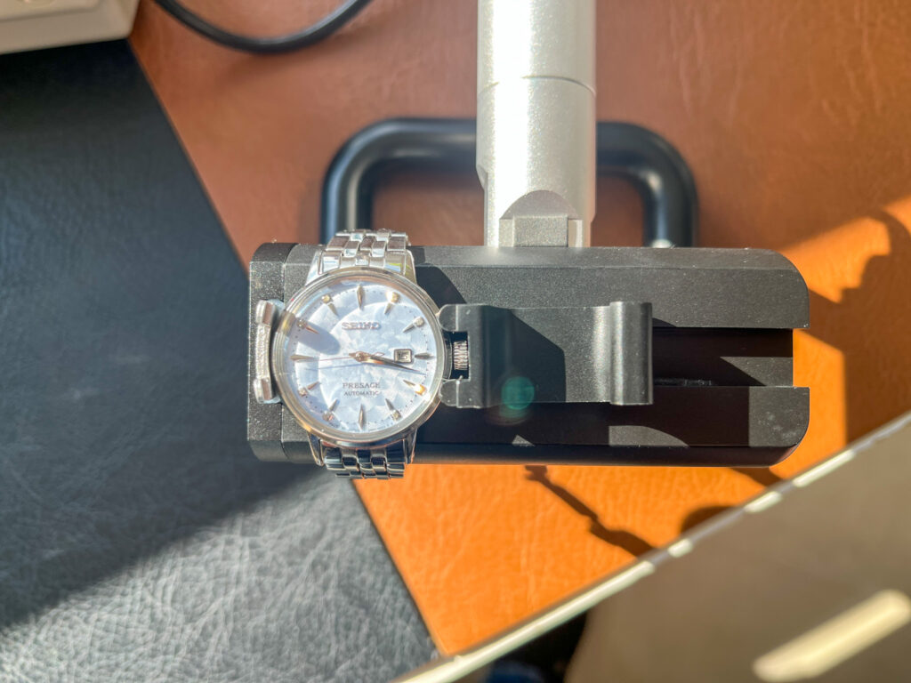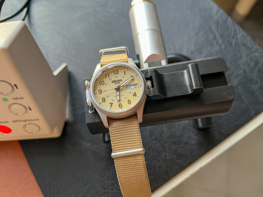 A timegrapher is an essential electronic device for measuring the accuracy of a mechanical watch. It works by using a sensitive microphone to record a watch’s beat, which is then displayed on a small LCD screen. To use it, you mount your watch on a stand connected to the microphone. Below, you can see the display and the stand that holds your mechanical watches.