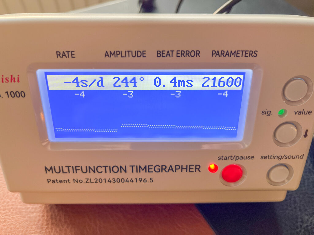 The beat error measures the time difference in how long the balance wheel swings in one direction versus the other. Ideally, the reading should be 0, but some watches are regulated to maintain a low beat error across multiple positions, while others are adjusted for just one position (usually dial-up). If your timegrapher shows a high beat error, a watchmaker can usually adjust the balance wheel to correct it.
